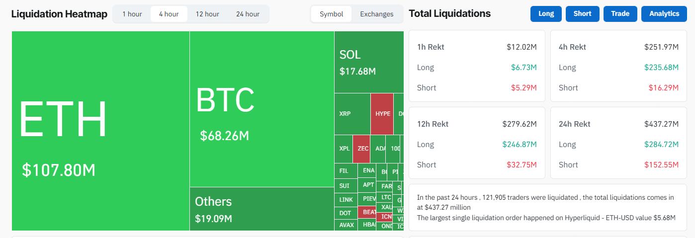 Liquidation data provides a clearer explanation. Over the past 24 hours, total crypto liquidations exceeded $430 million, with long positions accounting for the majority.