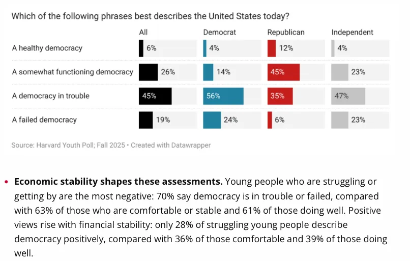 The project he led—the Harvard Youth Poll—surveyed more than 2,000 Americans aged 18 to 29 about trust, politics, and artificial intelligence. When asked whether they considered the United States a healthy democracy, respondents' answers showed clear partisan divisions, but concerns were evident.