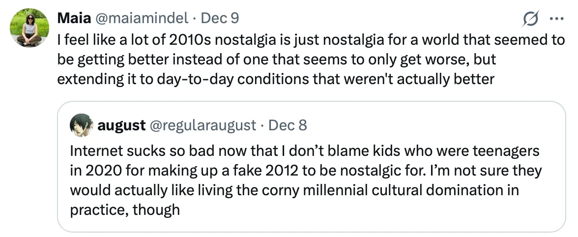 While the 2000s and 2010s had many problems (really many!), people's spirits didn't completely collapse. Today, there's even a nostalgiacore on TikTok, where teenagers are creating a beautiful fantasy of "2012"—a time of endless scarves, third-wave boutique coffee shops, and an era when Instagram was just for sharing photos of daisies in the fields, not the hyper-competitive algorithmic battlefield of today.