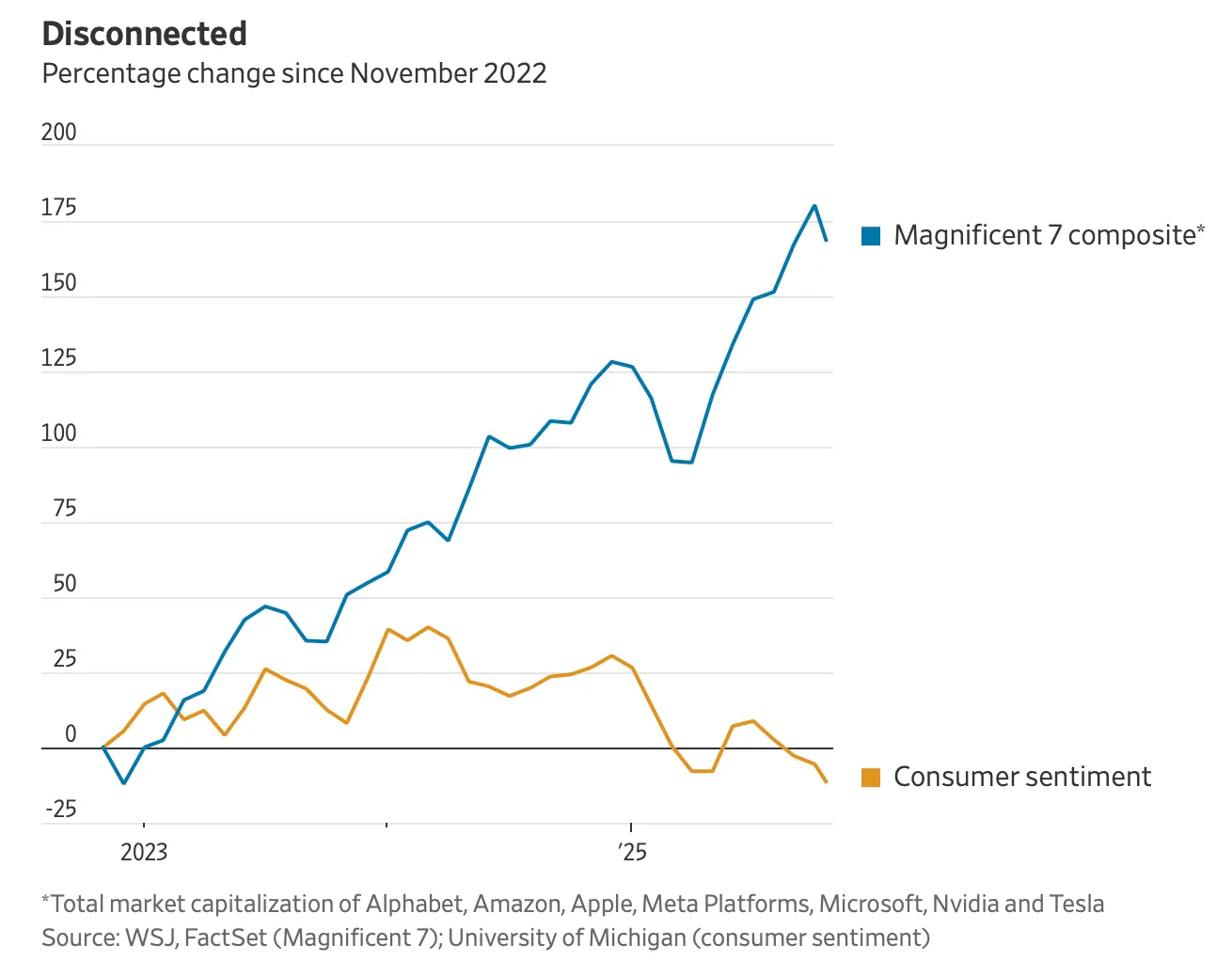 If we observe the decline in consumer sentiment, it (roughly speaking) fits the definition of a recession—it's prolonged, widespread, and sentiment levels are steadily approaching historic lows. Kevin Gordon of Schwab calls it " Vibepression "—extremely low sentiment, while GDP is propped up by investments related to artificial intelligence. Can an economy booming because of AI data center construction bring happiness to ordinary people? The answer is clearly no!