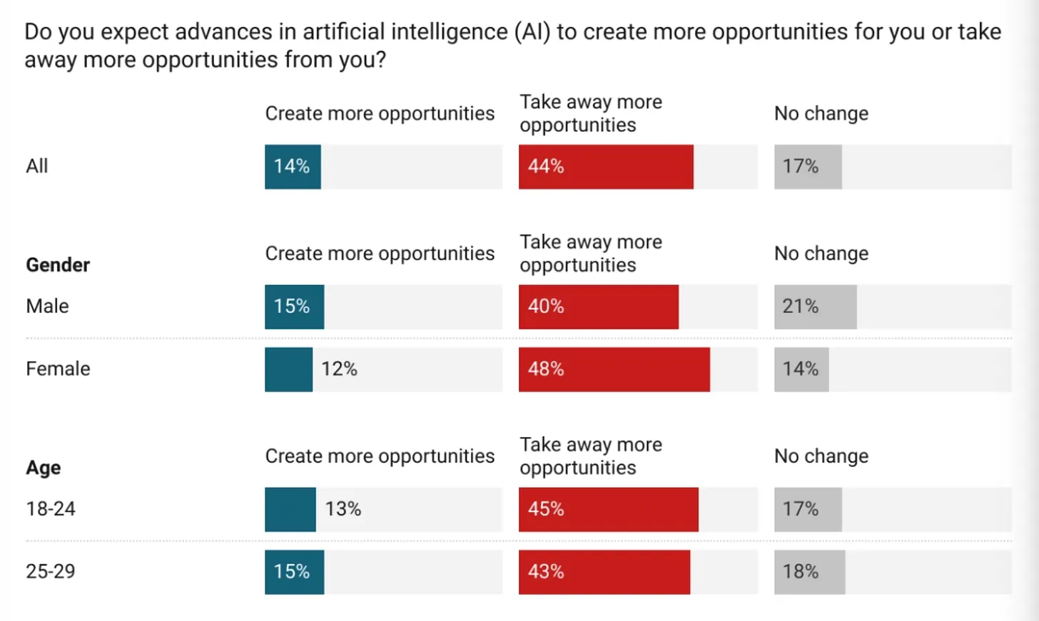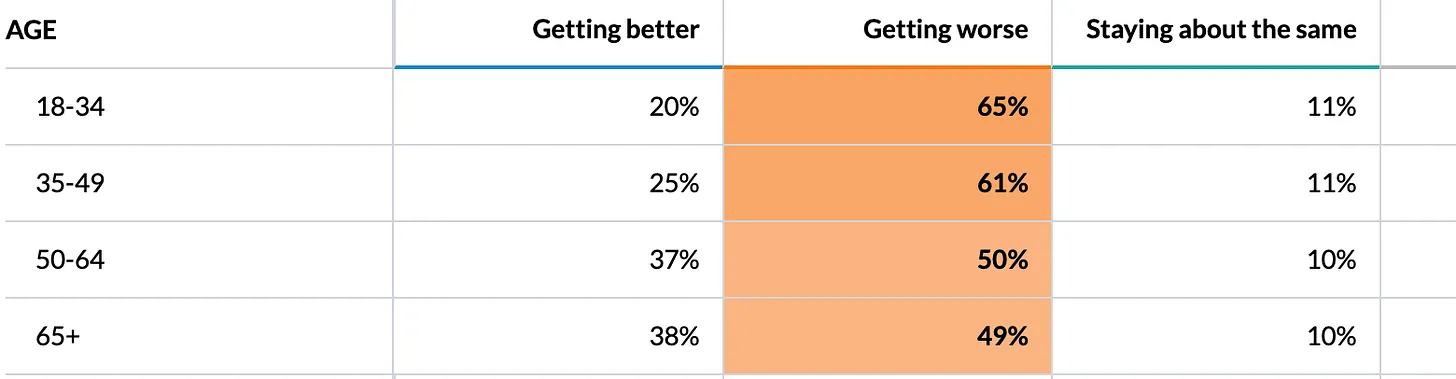 Source: Harvard Youth Opinion Poll. This may partially explain why nearly 40% of Americans over 50 believe the economy is "getting better," while the majority of Americans aged 18 to 49 believe it is "getting worse." These are two very different economic worlds. Older people are largely unaffected by the impacts of AI and housing, while younger people are facing the direct impact of these threats.