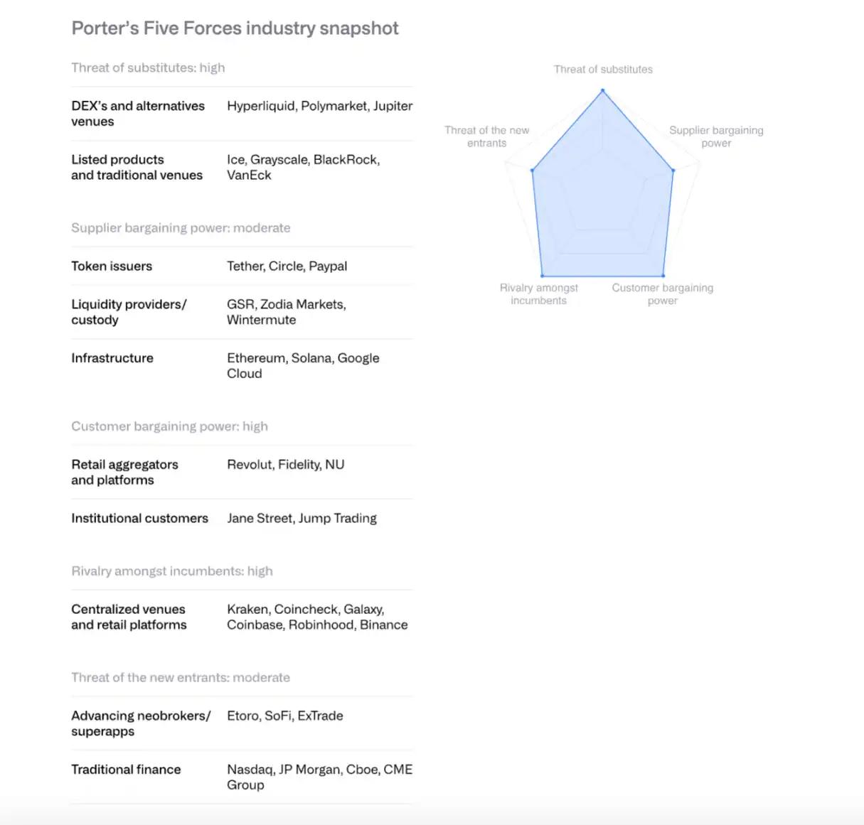 Threat of alternatives: Decentralized trading platforms such as Hyperliquid, prediction markets such as Polymarket, and CME crypto derivatives pose a competitive threat.